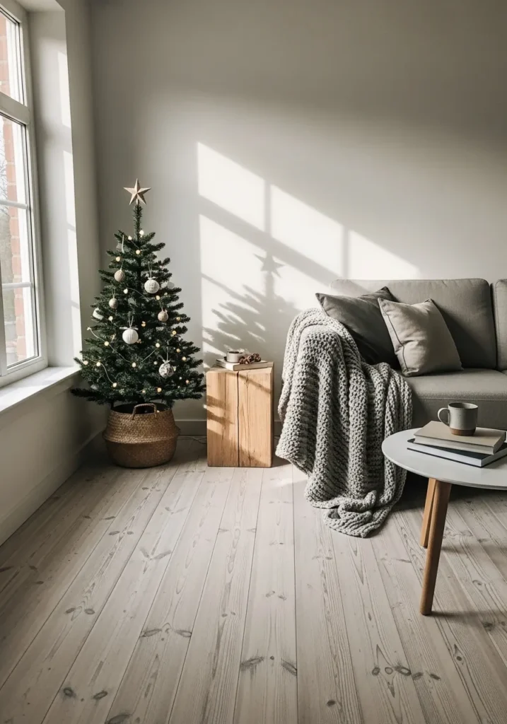 A petite Christmas tree sits in a woven basket beside a soft gray sofa and a chunky knit throw. Natural light fills the room, bouncing off pale wood floors and keeping the space bright and open. It’s perfectly balanced and effortlessly stylish.