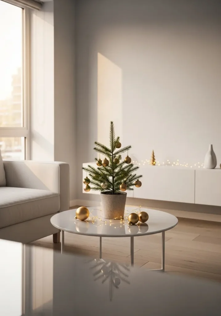 A petite Christmas tree in a neutral pot sits proudly on a round coffee table, dressed in golden ornaments that shimmer in soft daylight. The clean lines and subtle sparkle bring a sense of luxury without overwhelming the room. A few loose ornaments on the table and fairy lights complete the balanced, minimalist look.