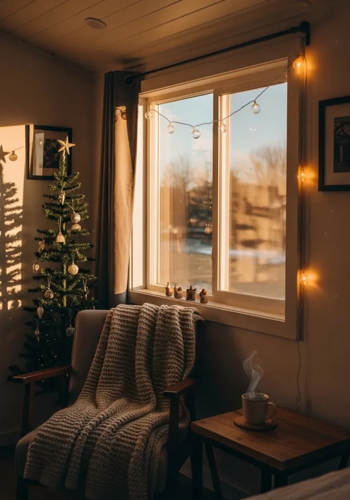 A small Christmas tree twinkles next to a window framed with glowing string lights, while a knit blanket draped over a cozy armchair invites you to settle in. The afternoon sunlight spills into the room, making everything gleam softly. It’s warm, quiet, and perfectly balanced.