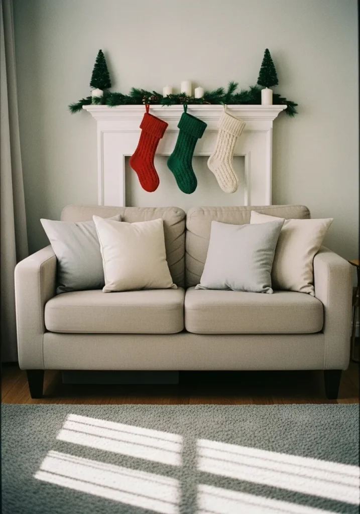This small-space mantel setup keeps things light and festive with just a few knitted stockings, a pair of miniature trees, and soft white candles. The simple greenery and neutral backdrop make the red and green pops stand out beautifully. Everything feels balanced and cheerful without taking up much room.
