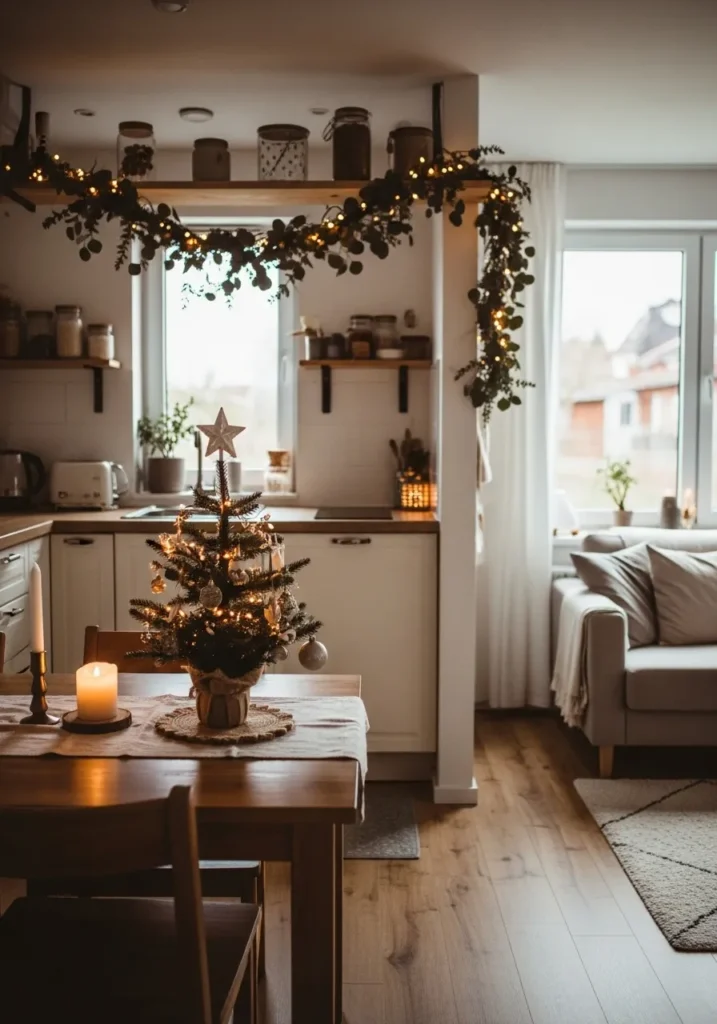 This cozy kitchen feels instantly festive thanks to the small decorated tree on the dining table and garlands of greenery draped across the shelves. The warm fairy lights blend perfectly with the wood tones, giving the entire space a golden, inviting glow.