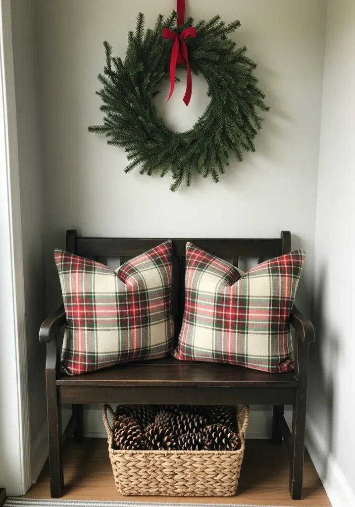 A fresh evergreen wreath with a red ribbon hangs above a dark wooden bench, framed by two plaid pillows and a basket of pinecones. The look is timeless, festive, and oh-so-welcoming. It captures that classic Christmas vibe with just a few carefully chosen pieces.