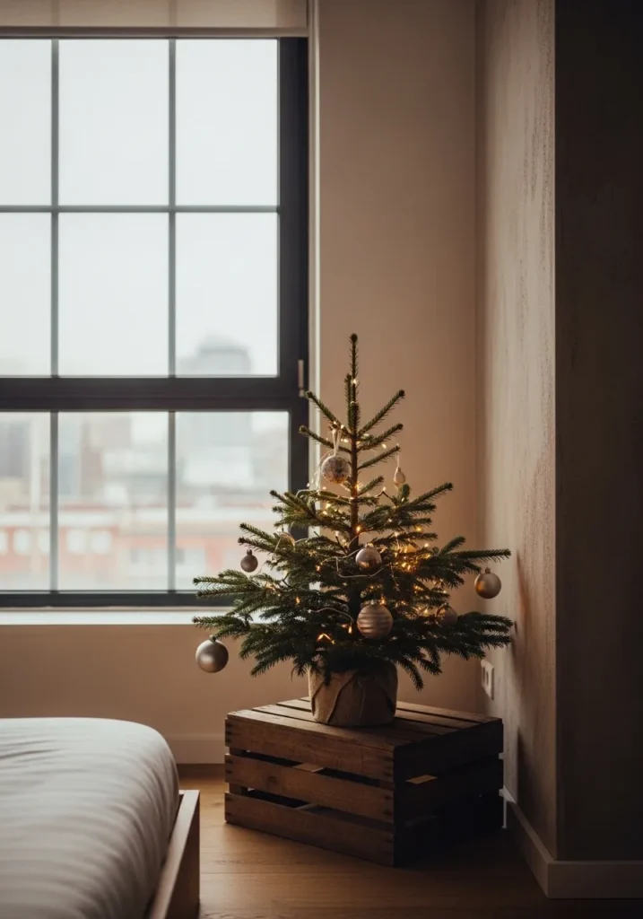 A tiny Christmas tree perched on a wooden crate makes this bedroom feel instantly festive. With warm fairy lights and muted ornaments, it adds a soft sparkle without taking up precious space. The natural light from the large window enhances the calm and cozy feel of the room.