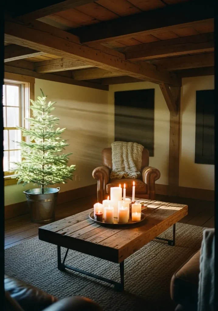 This rustic living room feels wonderfully homey with its wooden beams, leather chair, and a small potted Christmas tree in a metal bucket. A tray of glowing candles on the coffee table adds to the golden warmth that fills the room. Everything about it whispers comfort and calm.