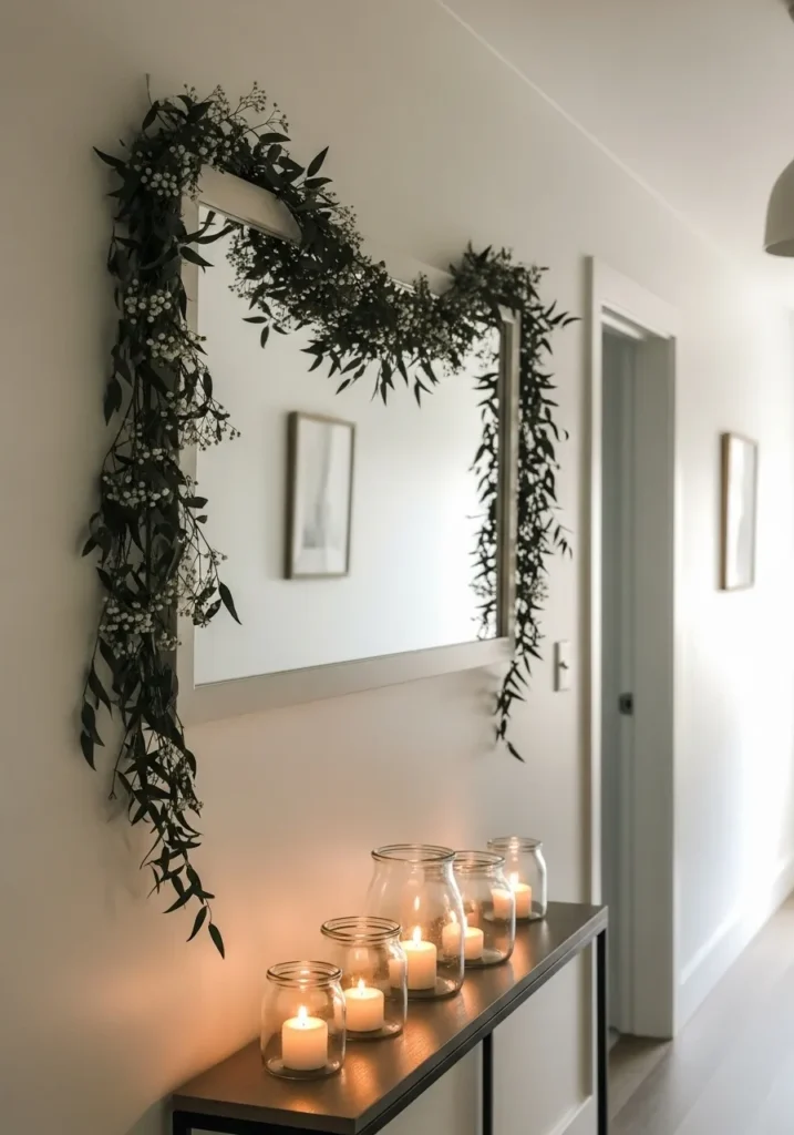 A row of glass jars filled with candles lights up this hallway, while a garland of greenery and white flowers frames the mirror beautifully. The look is clean, fresh, and quietly festive—proof that even a narrow hallway can feel inviting and full of charm.
