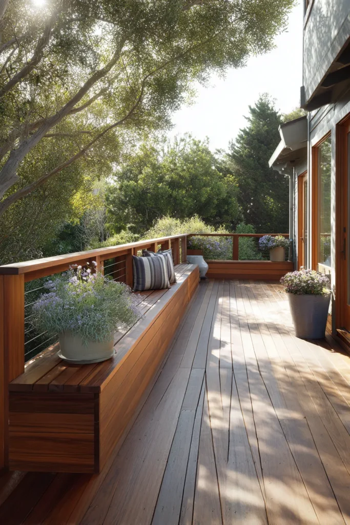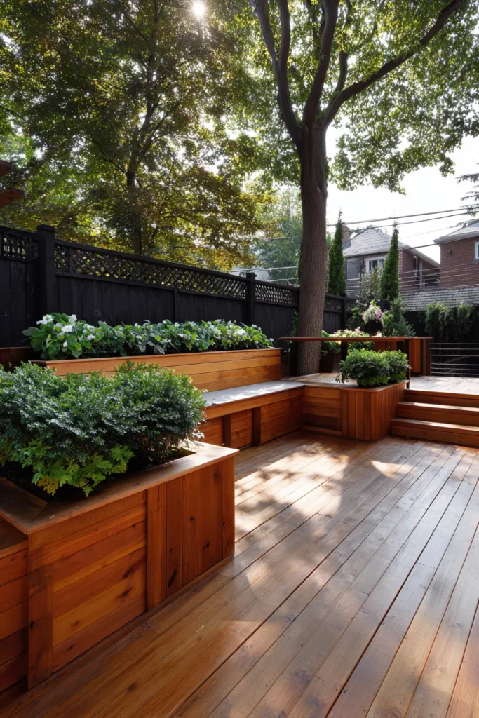This deck uses corner built in storage combined with planter boxes to keep clutter hidden while adding greenery. The wood finish ties everything together, making the deck feel cohesive and well planned.