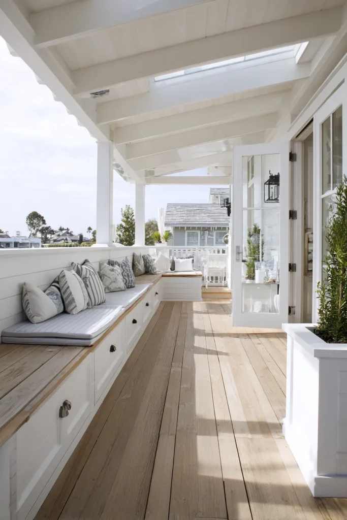 This bright covered deck uses a long built in bench painted in crisp white with discreet drawers tucked below. Light wood flooring and soft patterned pillows keep the space feeling airy and welcoming. The storage is perfectly placed along the wall, keeping the walkway open and clutter free.
