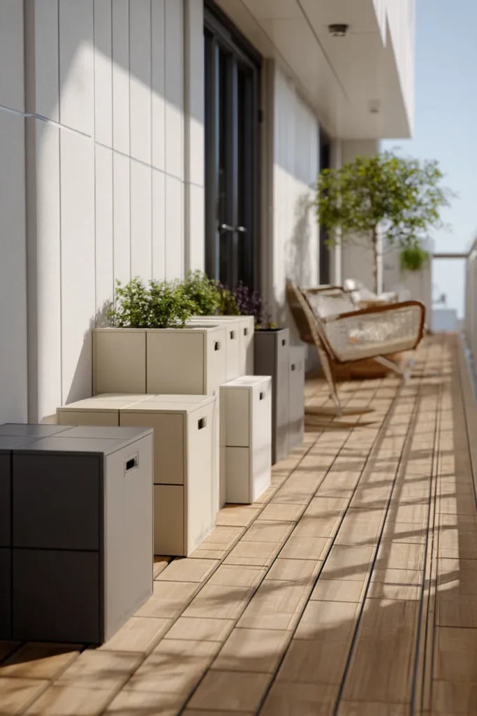 This narrow deck makes smart use of slim storage boxes lined neatly against the exterior wall. The soft neutral colors keep everything light while allowing plants to take center stage. Each unit feels compact and purposeful without crowding the walkway.