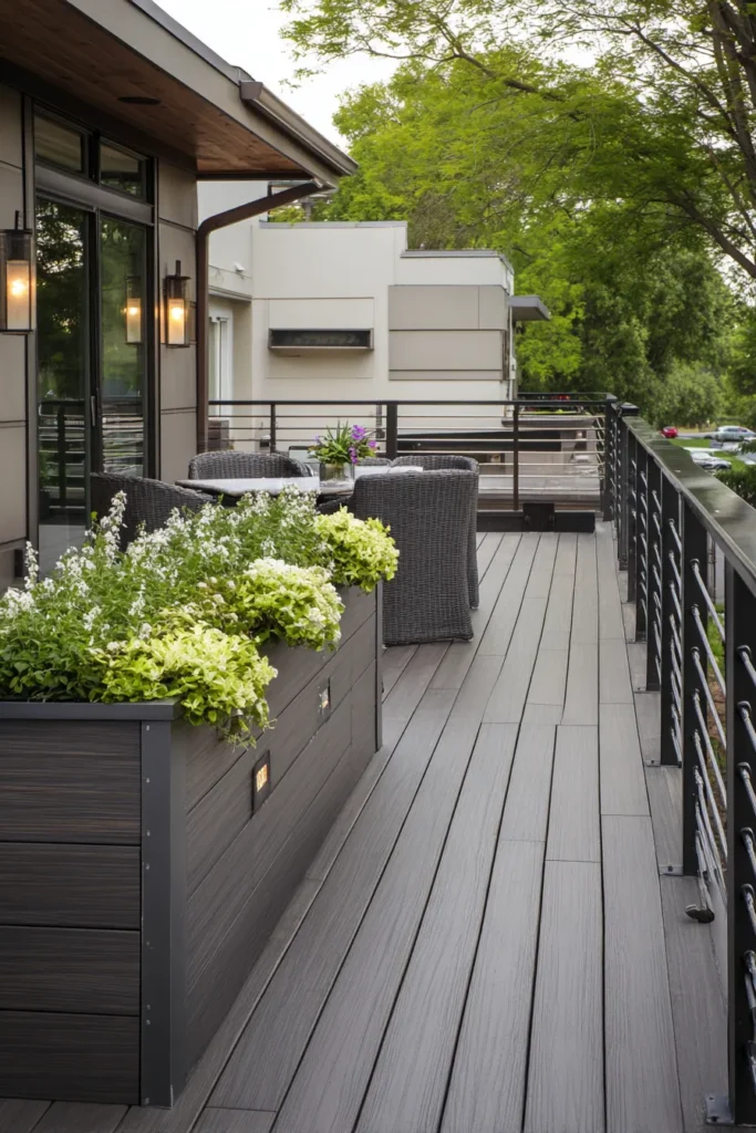 This deck combines sleek concrete planters with discreet storage compartments built into the base. The neutral tones keep everything looking calm and modern while the long horizontal layout enhances the sense of space.