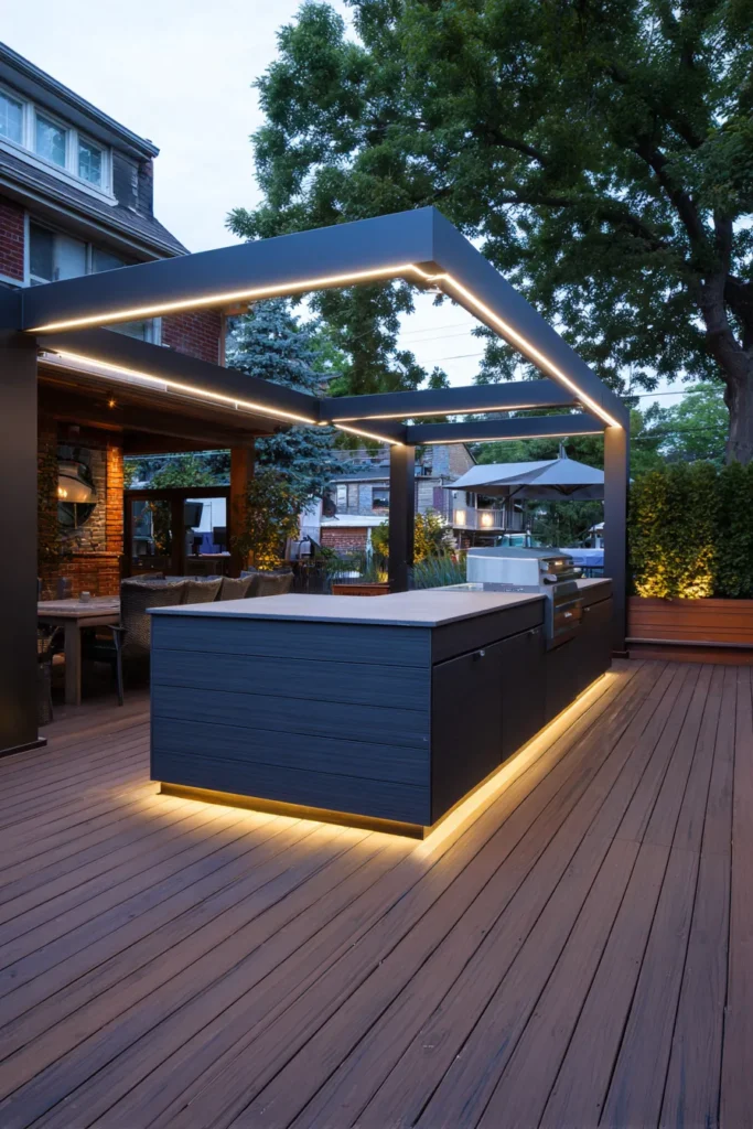 This deck features a sleek outdoor kitchen island with concealed cabinets and drawers built directly into the base. Soft lighting under the counters adds warmth while keeping the space functional after dark. Everything has a place, from grilling tools to serving essentials.