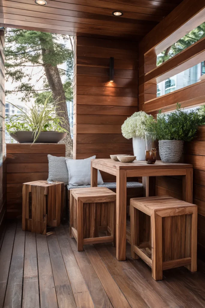This intimate deck nook uses solid wood stools and a compact table that double as storage pieces. The warm wood walls and soft greenery create a tucked away feel, perfect for quiet moments. Every piece feels intentional and multi functional.