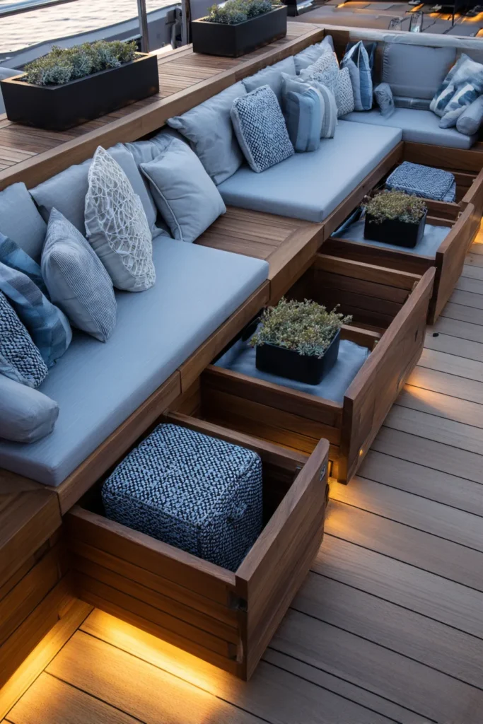 This deck seating area features deep built in benches with generous pull out storage drawers underneath. Soft blue cushions and textured pillows add a relaxed coastal feel, while subtle lighting keeps everything warm and inviting.