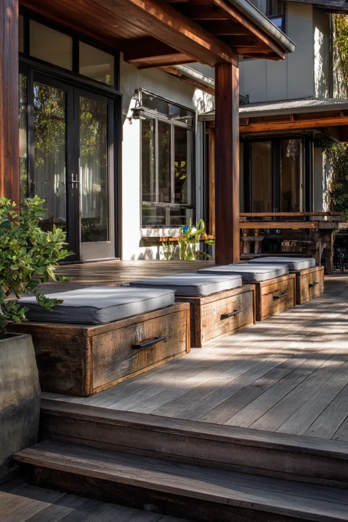 I think this idea is genius for anyone short on storage. I love how nothing looks obvious at first glance. It makes the deck feel clean and thoughtful while secretly holding all the things you do not want cluttering your view.