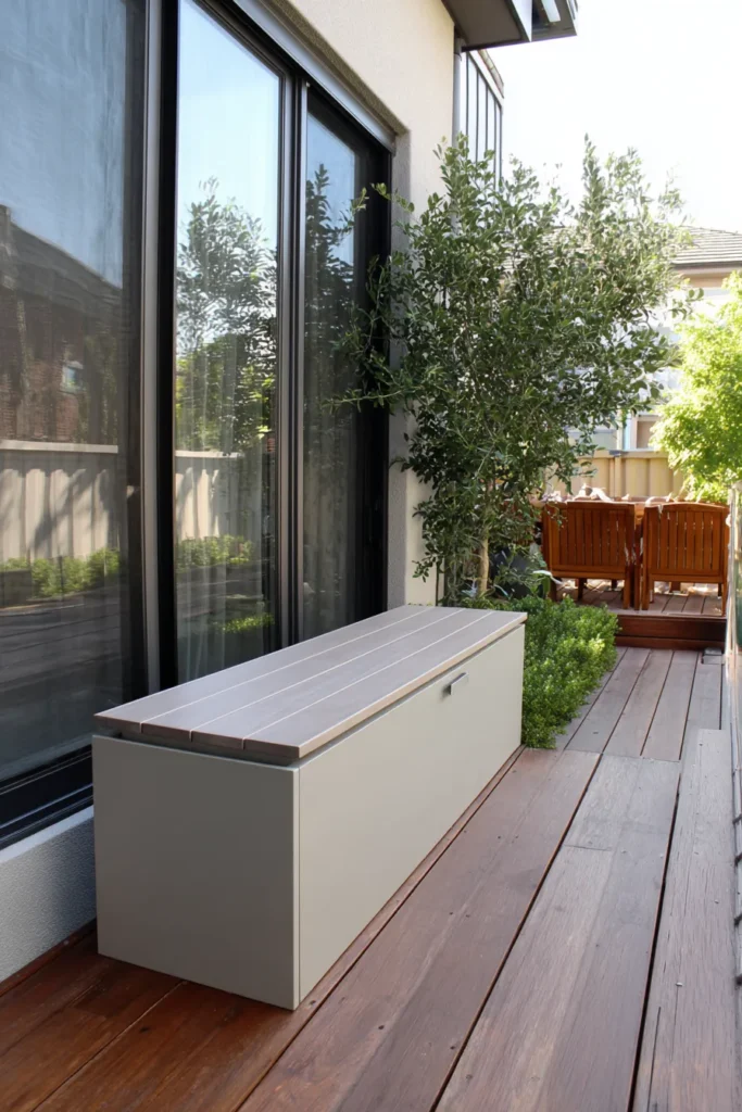 This narrow balcony uses a sleek storage bench placed neatly against the wall. The simple design keeps the space feeling open while providing hidden storage for outdoor essentials. Greenery adds life without overwhelming the layout.