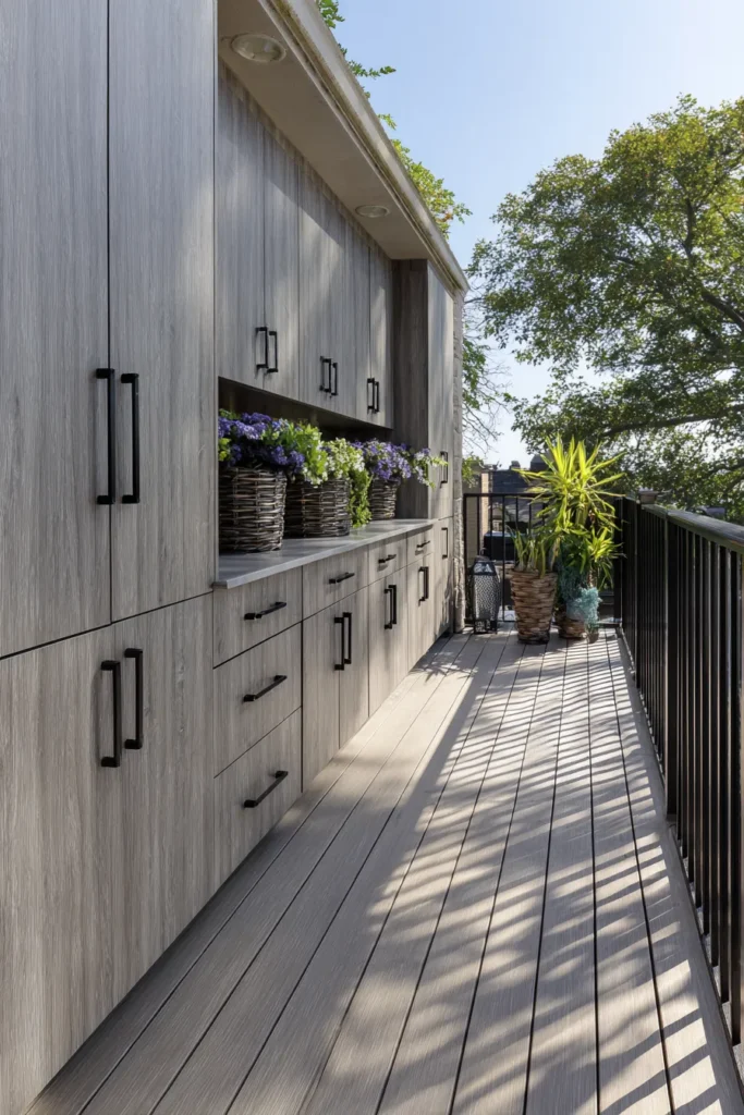 This long and narrow deck uses sleek wall mounted storage cabinets that run neatly along the house exterior. The light toned finish keeps everything bright while the integrated handles maintain a clean modern look. It is functional without ever feeling heavy or overwhelming.