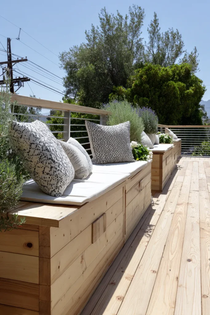 A built in wooden bench lines the deck edge with lift up storage hidden beneath plush cushions. The light wood pairs beautifully with soft neutral pillows and greenery, creating a relaxed and welcoming atmosphere.