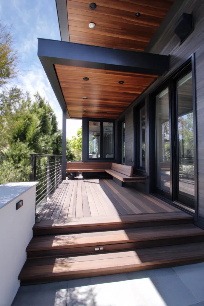 This spacious deck wraps around the home with a continuous built in bench that doubles as storage. The warm wood finish ties in beautifully with the surrounding greenery, while planters and cushions soften the look. Storage compartments are integrated along the bench without interrupting the clean lines.