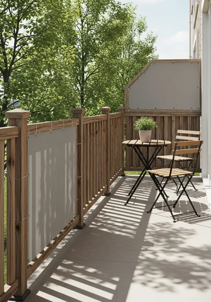 This balcony uses slim fence panels attached along the railing to create privacy while still letting light through. The vertical lines feel neat and structured without feeling heavy. It works perfectly in small outdoor spaces where floor space is limited.
