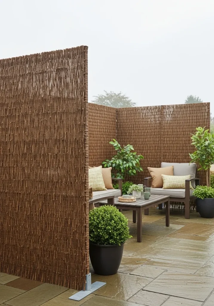 This design uses a freestanding bamboo style panel to block views from one side of the patio. The panel creates separation exactly where it is needed without enclosing the whole space. The natural material keeps the look warm and grounded. It is a smart option for flexible layouts.