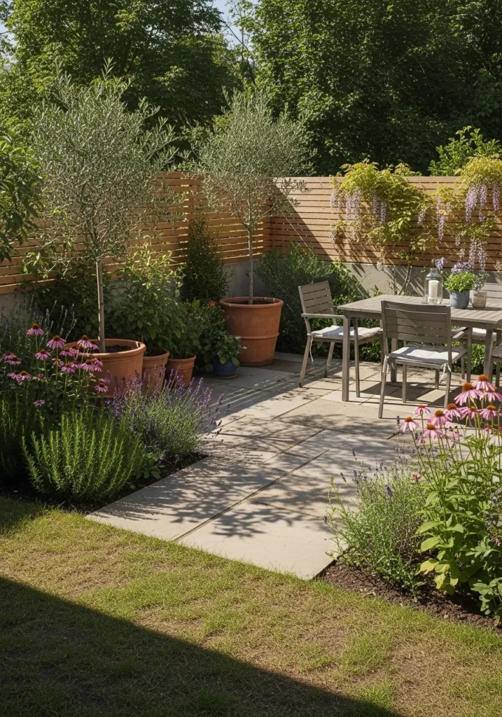 This patio uses layered plants and shrubs around the edges to create a soft privacy border. The greenery blends naturally into the surrounding garden and helps the patio feel tucked away. Stone paving and simple furniture keep the focus on the plants. It feels peaceful and well balanced.