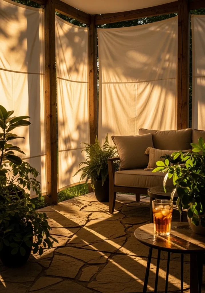 This patio corner uses fabric panels to create a warm and intimate seating area. The panels filter the light and give the space a cozy glow, especially in the evening. Potted plants and soft furnishings complete the relaxed atmosphere. It feels sheltered without feeling heavy.
