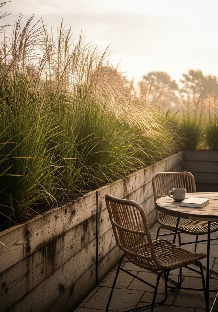 This patio uses tall ornamental grasses planted in a raised border to create a natural privacy screen. The grasses add height and texture while softening the hard lines of the patio wall. Everything feels cozy and slightly tucked away without blocking the light. It works especially well for small patios that need privacy without extra structures.