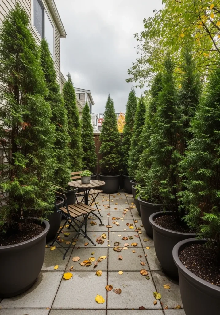 This narrow patio is lined with tall potted evergreens placed close together to create a green privacy corridor. The plants add height and structure while still letting light in from above. The look feels natural and organized at the same time. It works especially well in small spaces where fencing is not an option.