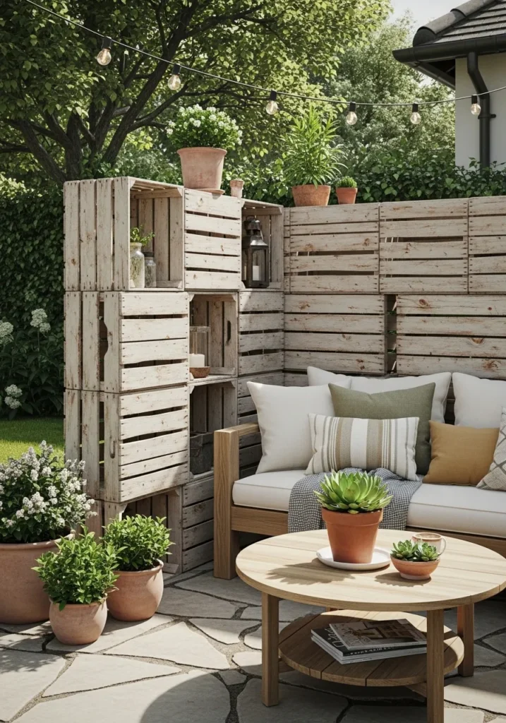 This patio uses stacked wood panels to create a simple privacy wall around the seating area. The wood has a relaxed and slightly rustic feel that pairs nicely with soft cushions and small potted plants. It blocks direct views while still feeling warm and welcoming.