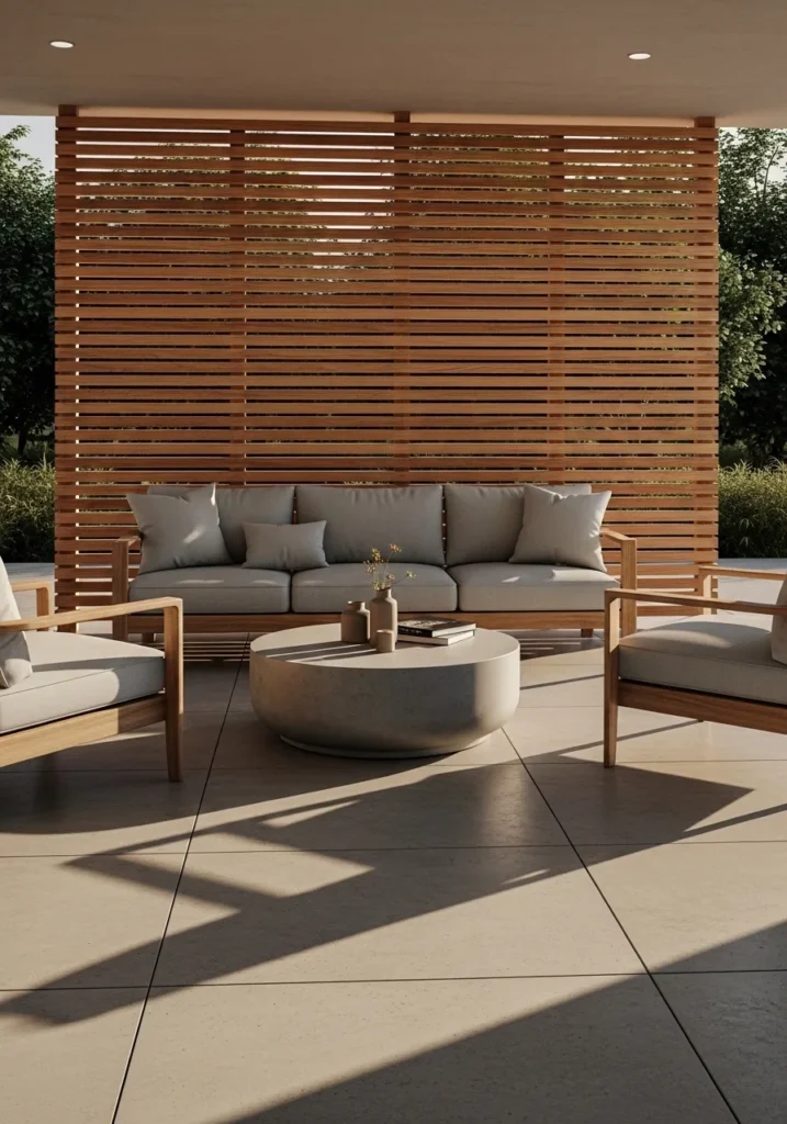 This patio features a horizontal wooden slat screen placed behind the seating area to block nearby views. The warm wood tone pairs beautifully with neutral outdoor furniture and clean patio tiles. Light still passes through, keeping the space bright and open. It feels modern but very comfortable.