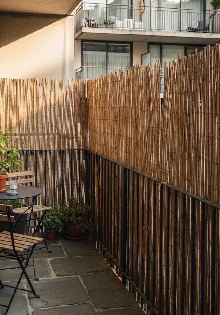 This patio uses a reed or bamboo fence attached along the edge to create quick and effective privacy. The natural texture adds warmth and blends easily with plants and outdoor furniture. It is a practical solution that works well for balconies and small patios. The look feels relaxed and unfussy.