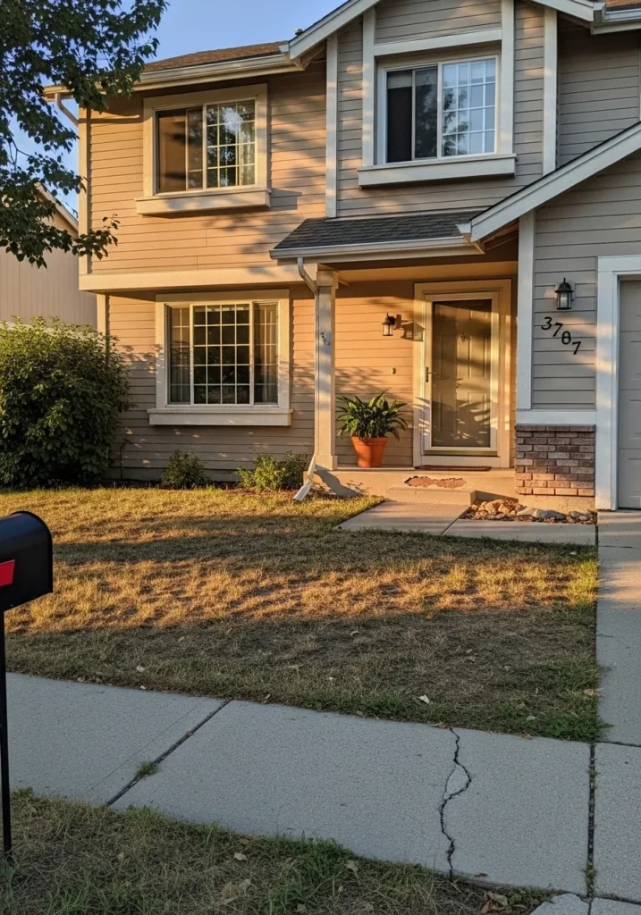 This two-story home showcases a classic suburban aesthetic with horizontal siding that catches the afternoon sun beautifully. The soft beige exterior is paired with crisp off-white trim around the windows and entryway, which creates a clean and structured look. A touch of red brick detailing near the garage and a simple concrete path add to the approachable and friendly curb appeal that many families adore.