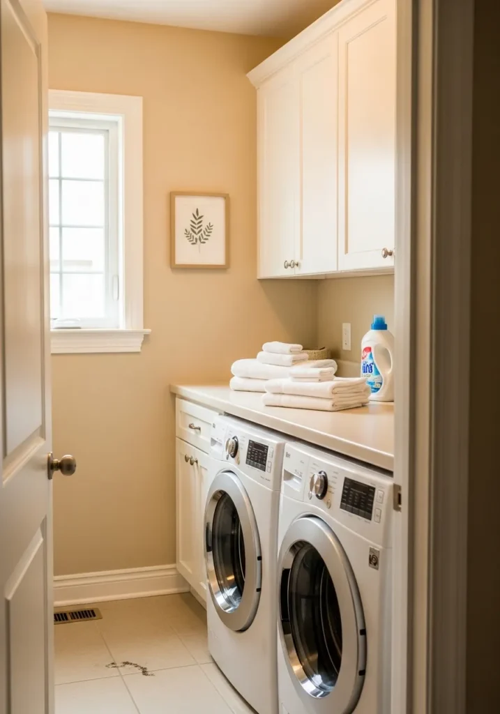 I feel like doing chores would be a lot less of a headache in a room that looks this cheerful. There is something so satisfying about the way the tan walls make the white cabinets pop without feeling too stark or cold. It strikes me as a very clever way to make a windowless or small corner of the house feel airy and intentional instead of just an afterthought.