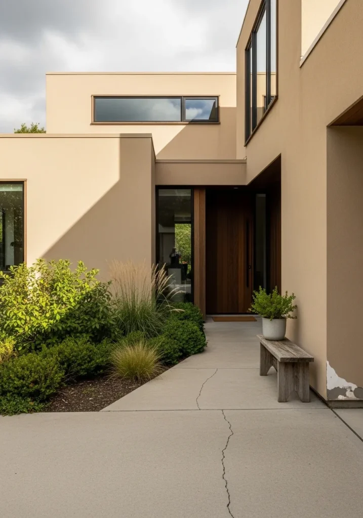 I am struck by how this color elevates the home from simple to sophisticated without needing any extra fuss. The way the shadows play off the different planes of the building really highlights the depth of this specific beige shade. It creates such a serene and expensive-feeling entry that manages to be incredibly impressive while staying totally low-key and welcoming.