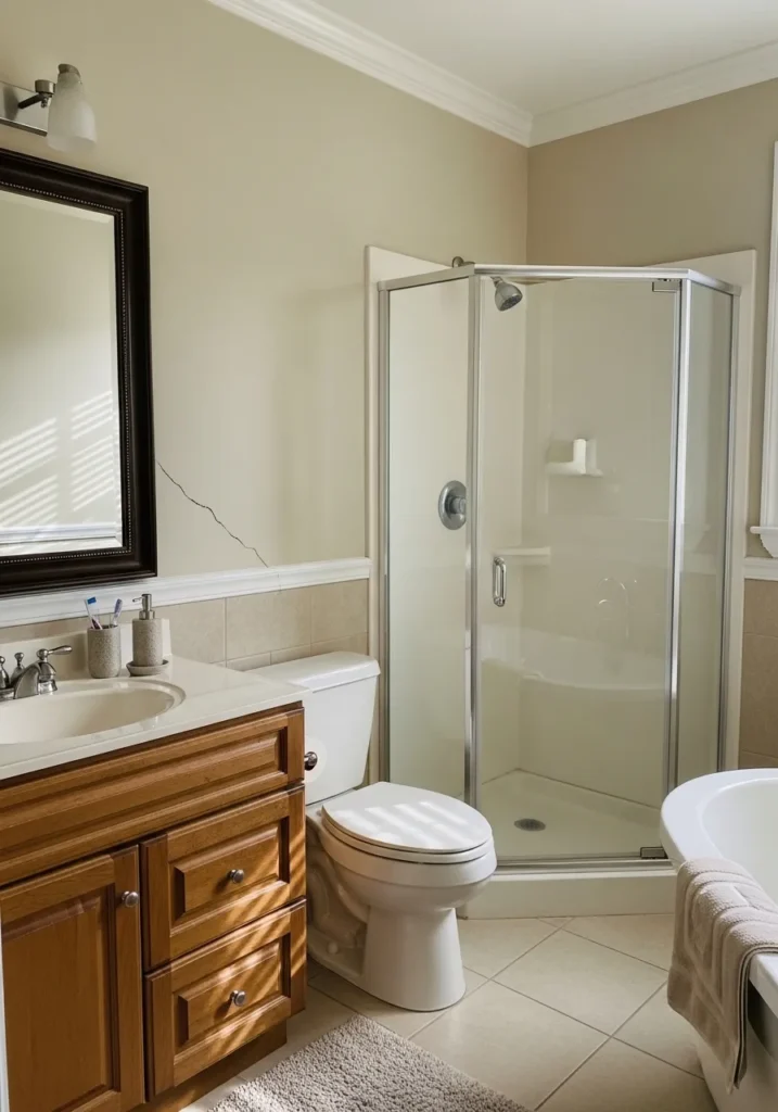 This bathroom design combines traditional wooden cabinetry with soft beige walls to create a space that feels both clean and warm. The layout features a classic corner glass shower and a large soaking tub that perfectly coordinate with the neutral floor tiles and creamy wainscoting. Subtle details like the dark-framed mirror and the brushed-nickel faucet add a layer of sophistication without overwhelming the small footprint of the room.