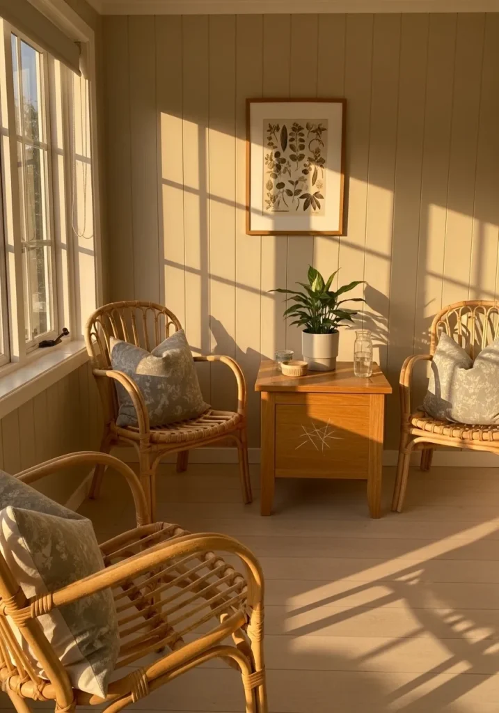 This gorgeous indoor nook features vertical wall paneling that looks incredibly chic under the intense golden hour light. The space is filled with light-toned rattan chairs and soft, patterned pillows that create a relaxed and beachy atmosphere. Large windows allow the late afternoon sun to cast dramatic linear shadows across the pale wood flooring and the central side table, which holds a fresh green plant in a simple white pot.