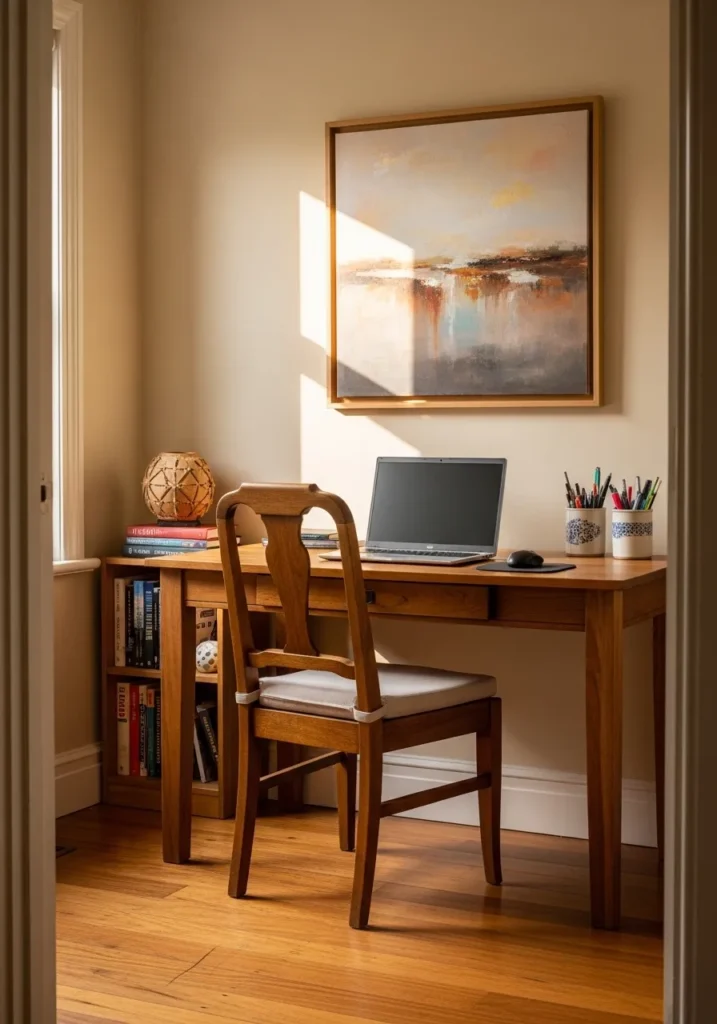 This compact workspace makes incredible use of a small corner by pairing creamy walls with rich honey-toned wood furniture. A classic wooden desk sits tucked against a low bookshelf while a large abstract painting adds a sophisticated splash of color that perfectly catches the afternoon sun. The white baseboards and window trim provide a crisp frame for the warm beige tones, which helps the whole area feel energetic yet calm enough for deep focus.