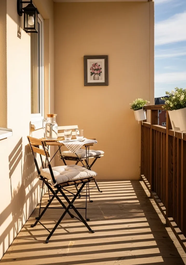 I am enamored with how this tiny outdoor space feels so expansive and bright. The way the shadows of the railing stretch across the deck adds such a dreamy and artistic layer to the whole scene. It really is an impressive example of how the right beige can turn a simple apartment balcony into a high-end sanctuary that feels like a permanent vacation.