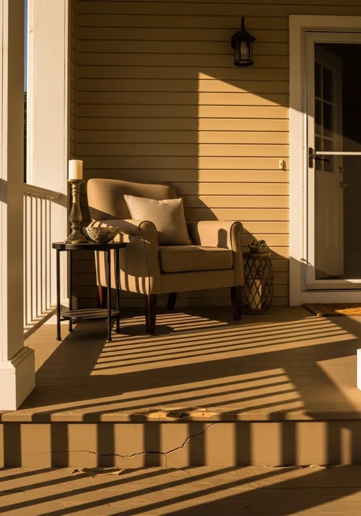 This inviting porch setup features narrow horizontal siding in a deep golden beige that looks incredible as the sun begins to set. A plush high-back armchair in a coordinating tan fabric creates the ultimate relaxation spot right next to a sleek black side table holding a classic pillar candle. The white porch railings and door trim provide a bright frame for the scene, while the long shadows stretching across the wooden deck add a layer of peaceful drama to the whole environment.