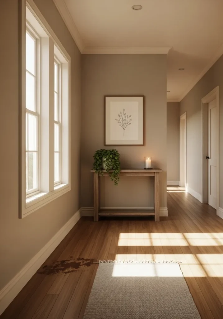 This elegant hallway proves that the right neutral can make even a simple thoroughfare feel like a destination. The walls are bathed in a beautiful taupe-leaning beige that perfectly complements the rich oak flooring and the natural light streaming through the large side windows. A slim wooden console table serves as a lovely focal point, topped with a trailing green plant and a glowing candle that adds a touch of life and warmth to the transition space.