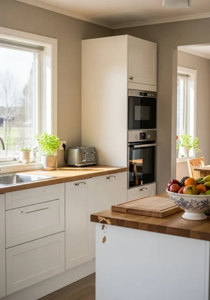 This kitchen combines bright white cabinetry with a deeper greige wall color that adds a wonderful layer of sophistication to the heart of the home. The butcher block countertops bring in a touch of rustic warmth, while the large window floods the area with light to keep the greige tones feeling fresh. Simple silver hardware and a bowl of vibrant fruit on the island make the space feel lived in and functional for a busy morning routine.