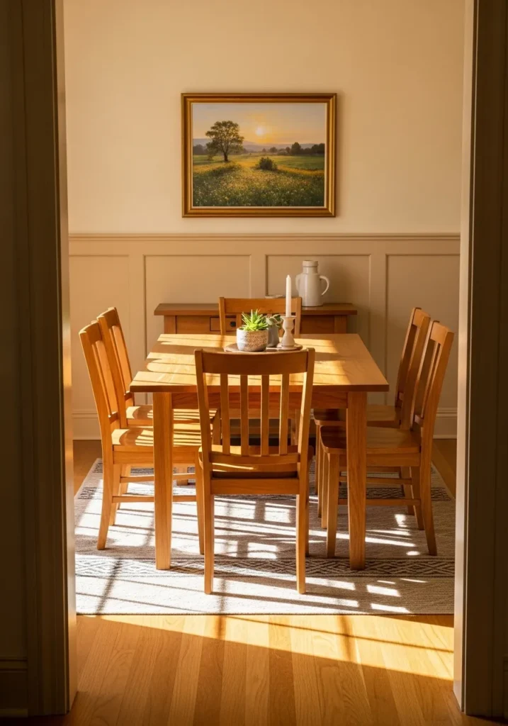 This dining area feels like a total dream with its classic wainscoting and rich oak furniture that catches the sunlight perfectly. The two-toned wall approach uses a creamy upper half paired with a deeper mushroom beige on the paneling, which adds so much architectural interest to the small space. A framed landscape painting of a golden field ties all the warm hues together, while the patterned rug keeps the vibe feeling grounded and approachable for family dinners.