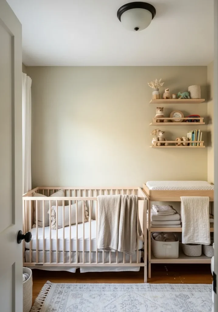 This nursery setup radiates pure tranquility with its soft, muted walls and light wood furniture. The space features a simple blonde wood crib and a matching changing table that both look wonderful against the creamy background. Floating shelves display a sweet collection of stuffed animals and books, while the white curtains and patterned rug keep the room feeling bright and open for a little one.