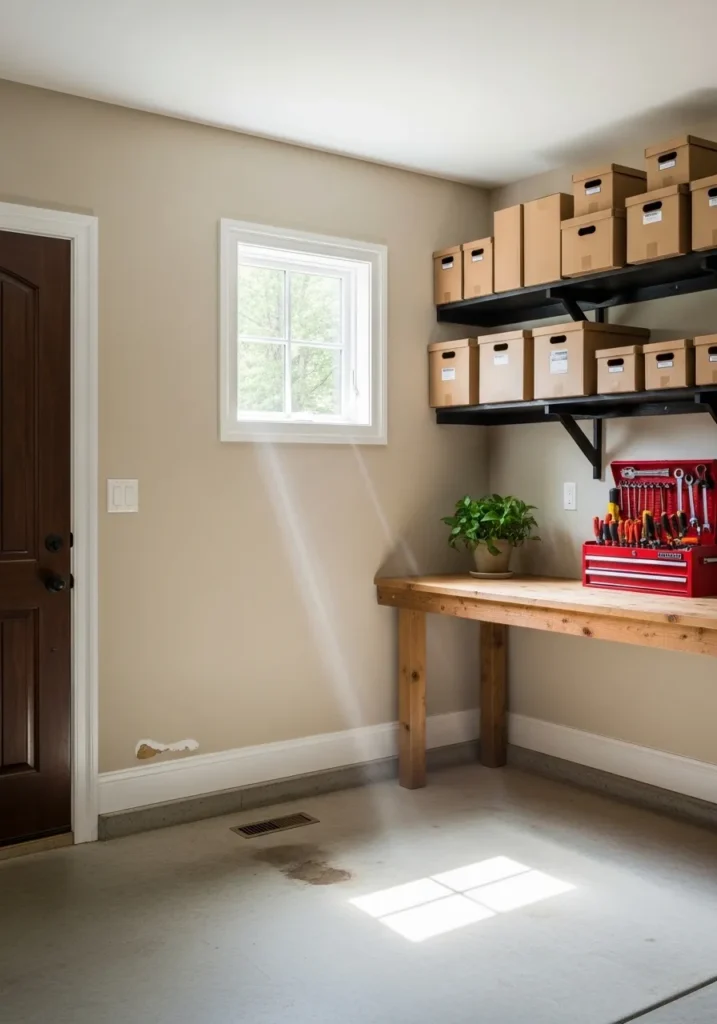 This garage or utility area proves that even functional zones deserve a little style with its smooth sandy walls and organized setup. The space features a heavy-duty wooden workbench and black industrial shelving that holds a neat row of uniform storage boxes. A small window lets in a bright beam of light that illuminates the clean concrete floor and highlights the warm undertones of the paint against the crisp white baseboards and dark wood door.