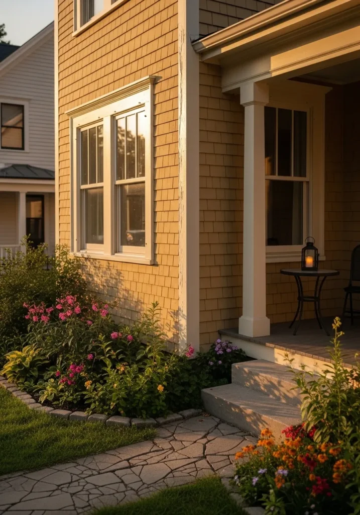 This charming two-story home features classic shingle siding that glows with a deep honey-beige hue under the afternoon sun. The warm walls are perfectly framed by crisp white window casings and a sturdy white porch column, which adds a nice, clean structure to the organic color palette. A stone walkway winds through a vibrant flower bed filled with pink and orange blooms, while a tiny bistro table with a lantern creates a sweet and inviting spot to enjoy the evening air.