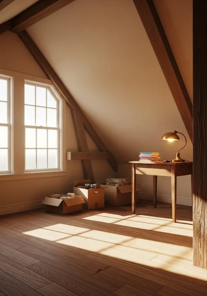 I like how this design turns a potentially cramped top floor into such a bright and airy sanctuary. It is truly impressive how the warm beige paint keeps the sloped ceilings from feeling heavy or closed in. The whole vibe reminds me of a quiet Sunday afternoon spent sorting through treasures, and I just find the simplicity of the wooden textures against that soft golden glow incredibly peaceful.