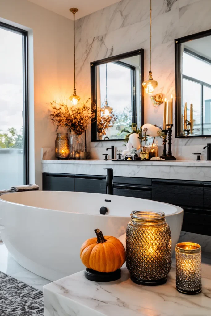 This bathroom pairs sleek marble walls with modern black cabinetry, giving it a luxurious yet moody atmosphere. A freestanding white tub takes center stage, while golden candlelight and a single pumpkin add just the right touch of seasonal charm. Glass lanterns, soft floral arrangements, and warm pendant lights create a glow that feels both inviting and refined, making the space ideal for a Halloween setting that is more chic than spooky.