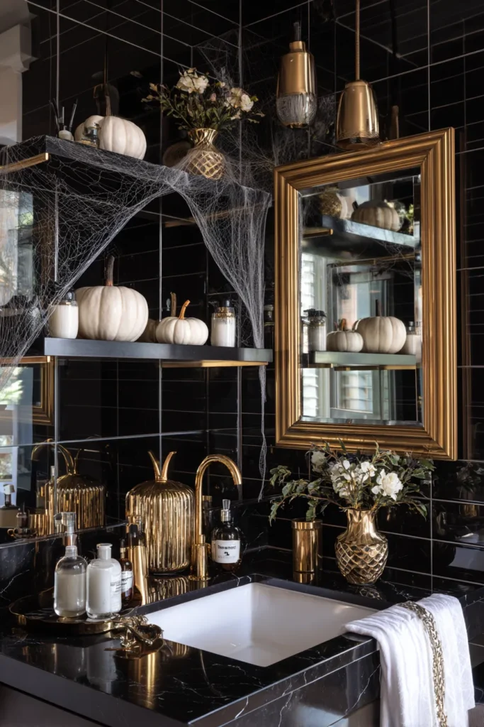 Bold black tiles and striking gold accents transform this bathroom into a dramatic yet stylish Halloween-ready space. White pumpkins rest against shiny gold vases, while cobweb details and elegant lighting add a festive flair. The glossy finishes and strong contrasts make this room feel glamorous, almost like a Halloween party dressed up in evening wear.