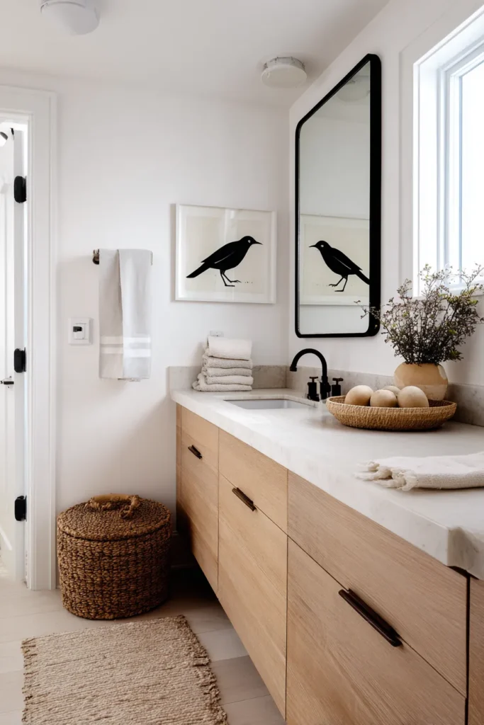 This bathroom shows how a minimalist style can still embrace the season. With natural wood cabinetry, a neutral stone countertop, and crisp white walls, the design is effortlessly clean. Halloween touches appear in the form of simple black crow artwork, a rustic basket, and a bowl of pale decorative spheres that feel subtly spooky without being cliché.