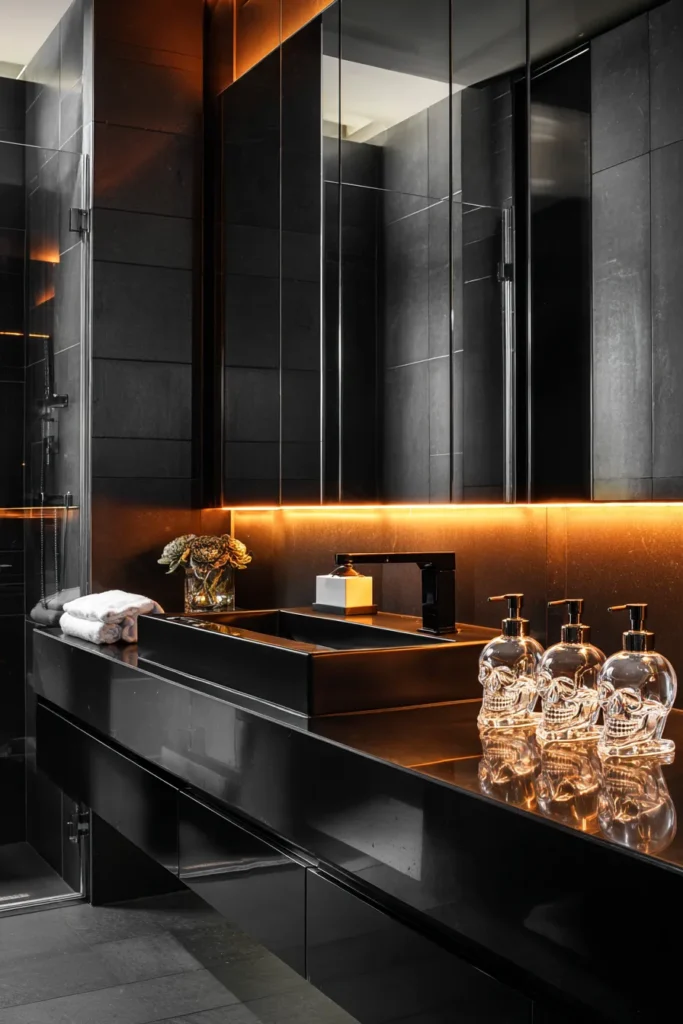 This bathroom is all about modern sophistication with glossy black finishes, mirrored cabinets, and warm amber lighting that casts a moody glow across the space. The sleek rectangular sink and minimalist design get a playful seasonal touch with crystal-clear skull soap dispensers that stand out perfectly against the dark backdrop. The balance of luxury and subtle spookiness makes this bathroom feel bold and unforgettable.