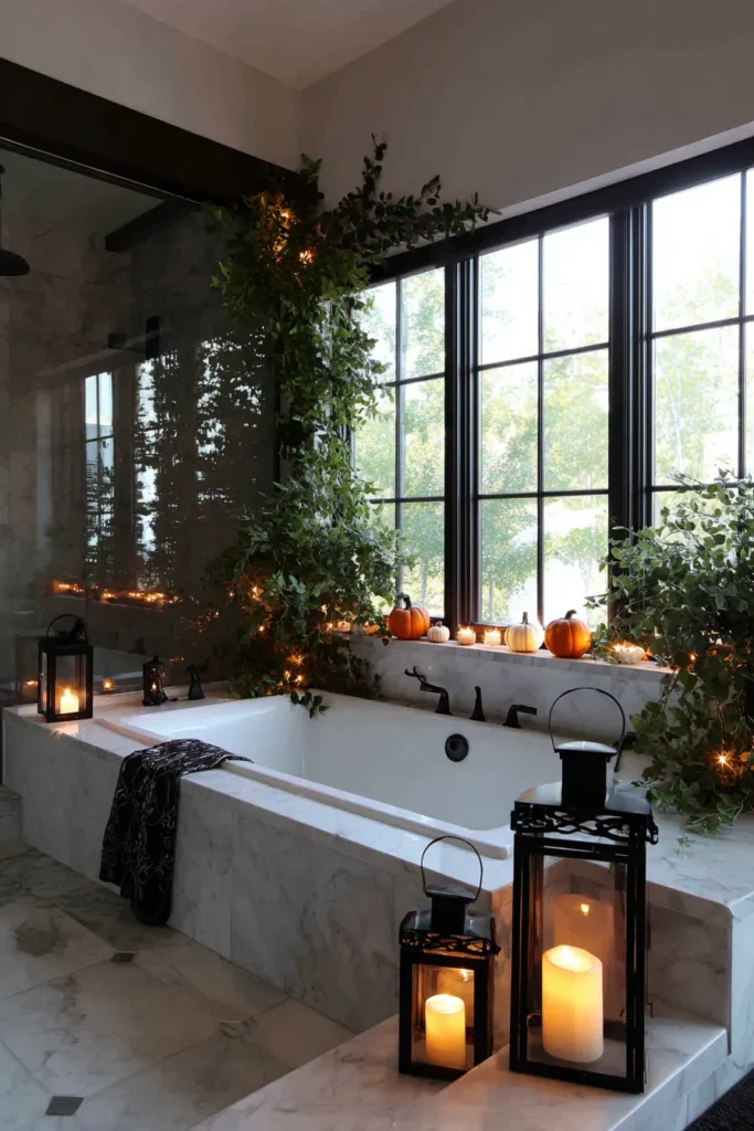 A deep marble tub sits beneath a wall of windows, framed by lush greenery and warm candlelight. Pumpkins in different sizes line the windowsill, while lanterns on the floor glow softly, giving the entire space a magical autumn atmosphere. The mix of natural light during the day and soft candlelight in the evening makes this bathroom feel like a private seasonal hideaway.
